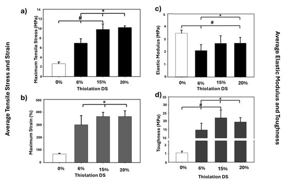 In another 2016 study, Miles and his coworkers conducted a study to investigate different methods to improve the mechanical properties of chitosan films by cross-linking via disulfide bonds [91]. Chitosan’s amines were covalently attached to N-acetyl-l-cysteine (NAC), which contains thiol groups, to produce an NAC-modified chitosan conjugate (NAC–Ct) [91]. In the study, the mechanical properties were evaluated using tensile stress, strain, elastic modulus, and toughness. The results showed NAC cross-linking to chitosan improved the mechanical properties of chitosan biopolymer (Figure 1). The films exhibited the highest tensile strength of 10.26 MPa (Figure 1a) and maximum breaking strain of 365% (Figure 1b), suggesting the disulfide bonds formed from NAC enhanced the films’ polymer network. The film modulus increased (3.48 ± 0.24 MPa) in comparison to the unmodified chitosan film (Figure 1c). Furthermore, the film’s elasticity and toughness significantly increased to 14.54 MPa for the 6% DS NAC–Ct, putting an emphasis on the film’s resistance and elasticity (Figure 1d) [91]. Overall, sufficient evidence is shown on how cysteine chemistry, via cysteine derivative NAC, improved the film’s mechanical integrity while maintaining its elasticity and flexibility for the desired soft tissue type.