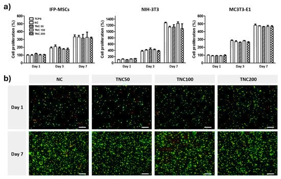 Disulfide-cross-linked NIPAAm-g-chitosan hydrogels cytocompatibility assays with (a) cell proliferation of TCPS, NC, TNC (50/100/200) in MSCs, fibroblasts, and osteoblasts cells analyzed over 1–7 days, and (b) cell viability of MC3T3-E1 osteoblasts cells in TCPS, NC, TNC using Fluorescent Live/Dead assay staining kit, where red cells = dead cells and green cells = live cells over 1–7 days. Scale bar 100 μm. Reproduced from [112] under the terms of Creative Commons CC-BY © 2018, Elsevier.