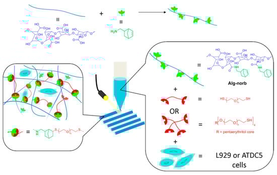 In a 2018 study, a group of researchers designed a norbornene-functionalized alginate bioink by using dithiol PEG cross-linker at different concentrations to generate a rapid UV-induced thiol–ene cross-linking reaction (Figure 4) [140]. Alginate was modified with norbornene groups for formulating tunable Alg-norb. The bioink was fabricated by bioprinting prior to UV light exposure for optimal thiol cross-linking. The schematic overview (Figure 4) aids viewing of the polymer’s chemical structure during the reaction. The study results showed that high cell viability and printability at low concentrations (2 et%) were achieved. Additionally, the mechanical properties improved (G′ from 0.05 to 10 kPa), and increasing the molecular weight from 1500 to 5000 Da increased the swelling behavior of the hydrogel [140]. Overall, the study showed a well-compacted hydrogel network by using UV-induced thiol–ene cross-linking, and thus a hydrogel bioink was successfully formulated and can be used for 3D bioprinting.