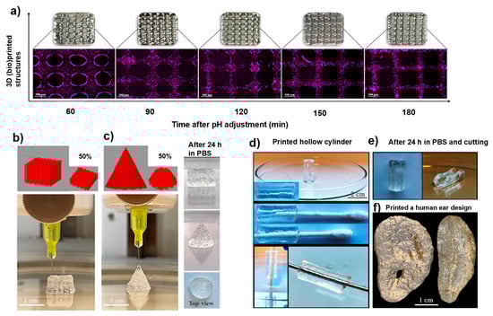 In another study, Tavakoli and coworkers designed a hyaluronic acid (HA)-based bioink, where HA was reacted with cysteine residues for disulfide bond cross-linking to occur. HA-Cys bioink was introduced to potassium iodide (KI) for gelation to produce HA-Cys-KI bioink [120]. The 3D-printed scaffolds were novel ECM-mimetic bioinks with improved mechanical properties from the thiol reactions present, as shown in Figure 5. The study proved enhanced printability of the hydrogel bioink when printed via 30G nozzles (Figure 5a), and various structures and shapes were printed in both cone and cube cylinders and maintained shape after 24 h incubation (Figure 5b,c). Additionally, the bioink was printed as a hollow cylinder (Figure 5d) and followed by sectioning (Figure 5e). The complexity of Figure 5f demonstrates the hydrogel bioinks’ printability and highlights the inks’ capacity for high-fidelity bioprinting [120]. Overall, this study proved the ability of cysteine cross-linking to aid in printing ability and performance, and biocompatibility.