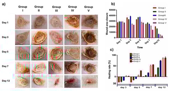 Rat models were used for wound healing of this thiolated hydrogel film, where the results demonstrated improved wound healing (Figure 6a). Rat models were treated with rats treated with TPGS-SH-Au–Ag nanoparticle-loaded chitosan films, where Group I, as the control, had minimal wound closure with observable wound margins, Group II had moderate healing, but Group III had improved wound closure, suggesting the thiol present enhanced the bioactivity in the microenvironment. The thiolated chitosan film had the fastest closure rate, showing superior wound closure and minimal scarring (Group V) [145]. Optimal wound closure was observed, and the thiolated chitosan film had the fastest closure rate (Figure 6b). Wound healing (%) was highest in Group IV among all other groups (Figure 6c). The presence of the thiol enabled ROS scavenging capacity while enhancing cellular migration and collagen deposition, thus successfully repairing tissue [145].
