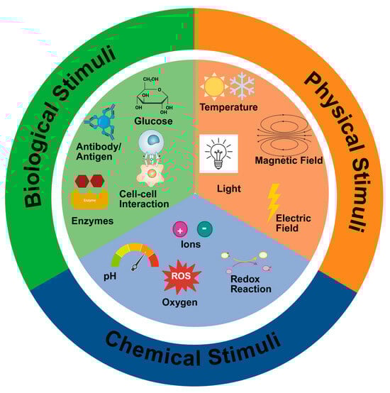 The CRP–disulfide exchange reversible reactions can aid in the development of both self-healing and stimuli-responsive scaffolds. A scaffold with self-healing properties has increased durability and a higher probability of tissue regeneration due to its ability to maintain and preserve its functionality under stress [155]. On the other hand, stimuli-responsive scaffolds can respond to specific stimuli such as pH, temperature, light, and enzymes (Figure 7) [156,157]. The response mechanism of these scaffolds to stimuli is either to release therapeutic agents, alter their mechanical strength or degradation rates, making them highly biocompatible; thus, incorporating thiol reversible reactions, the scaffolds can respond to these various stimuli [158].
