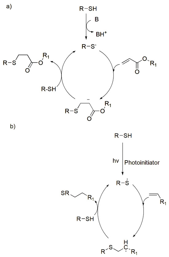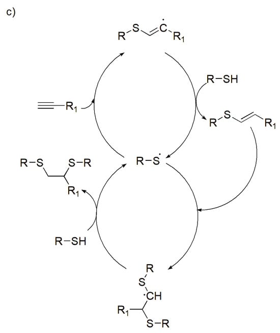 Schematic of thiol reactions: (a) thiol Michael-type addition reactions (B—indicating the base), (b) photo-initiated thiol–ene reactions, (c) photo-initiated thiol–yne reactions. Adapted from [24] with permission under the terms of Creative Commons CC-BY © 2020, Elsevier.