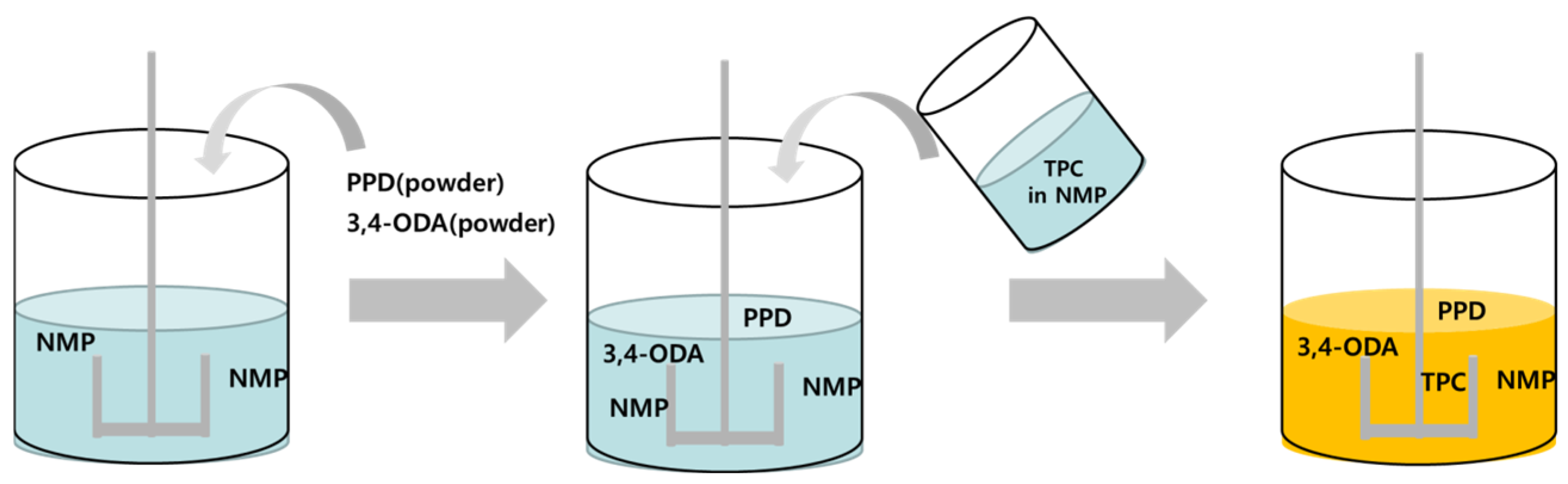 Figure 2, the copolymer aramid dope was prepared by dissolving p-phenylenediamine (PDA) and 3,4′-oxydianiline (ODA) in N-methyl-2-pyrrolidone (NMP), followed by the addition of terephthaloyl chloride (TPC) to initiate solution polycondensation [