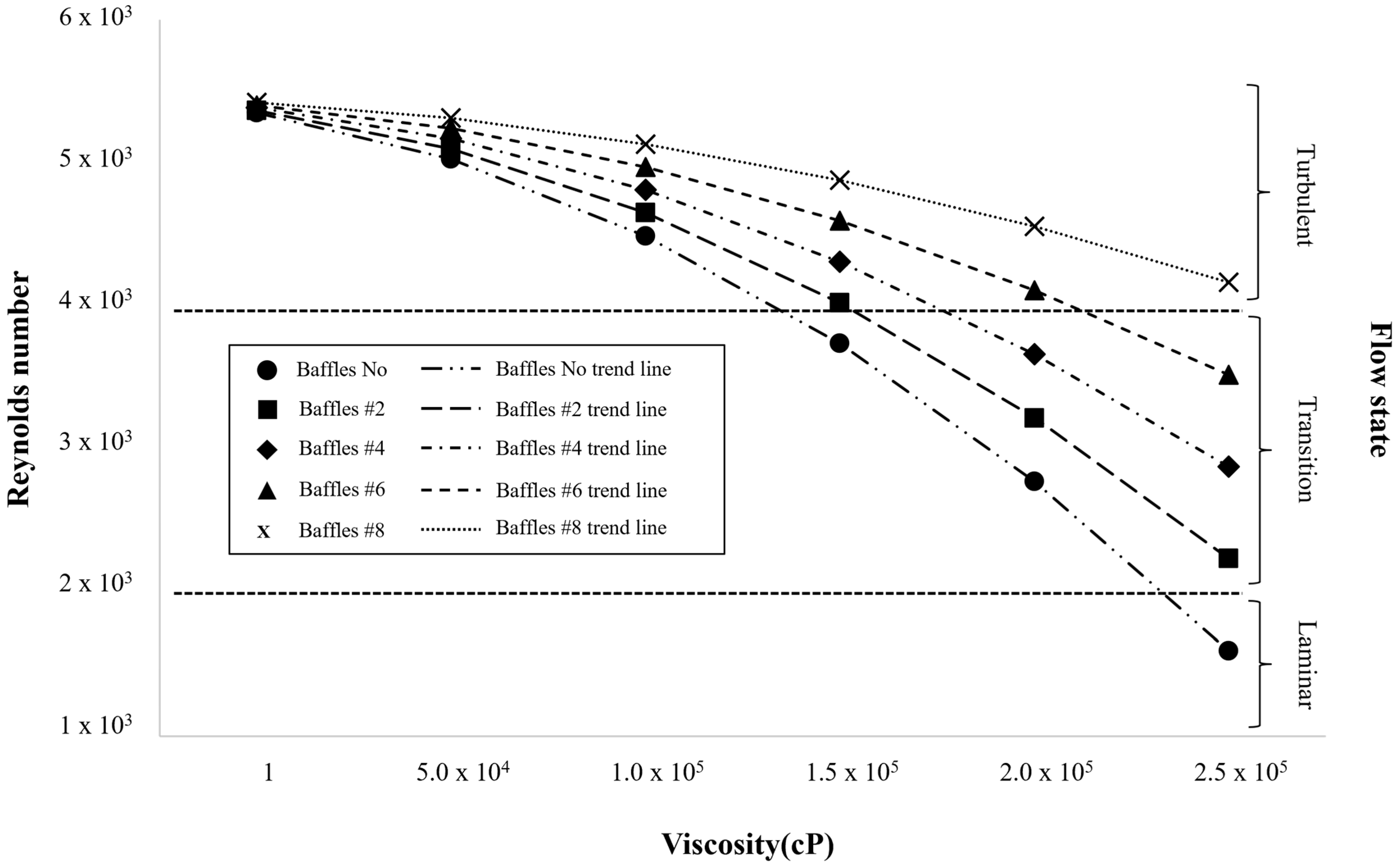 Variation in Reynolds number with viscosity for different baffle configurations (0, 2, 4, 6, and 8), indicating the transition boundaries between turbulent, transitional, and laminar flow regimes.