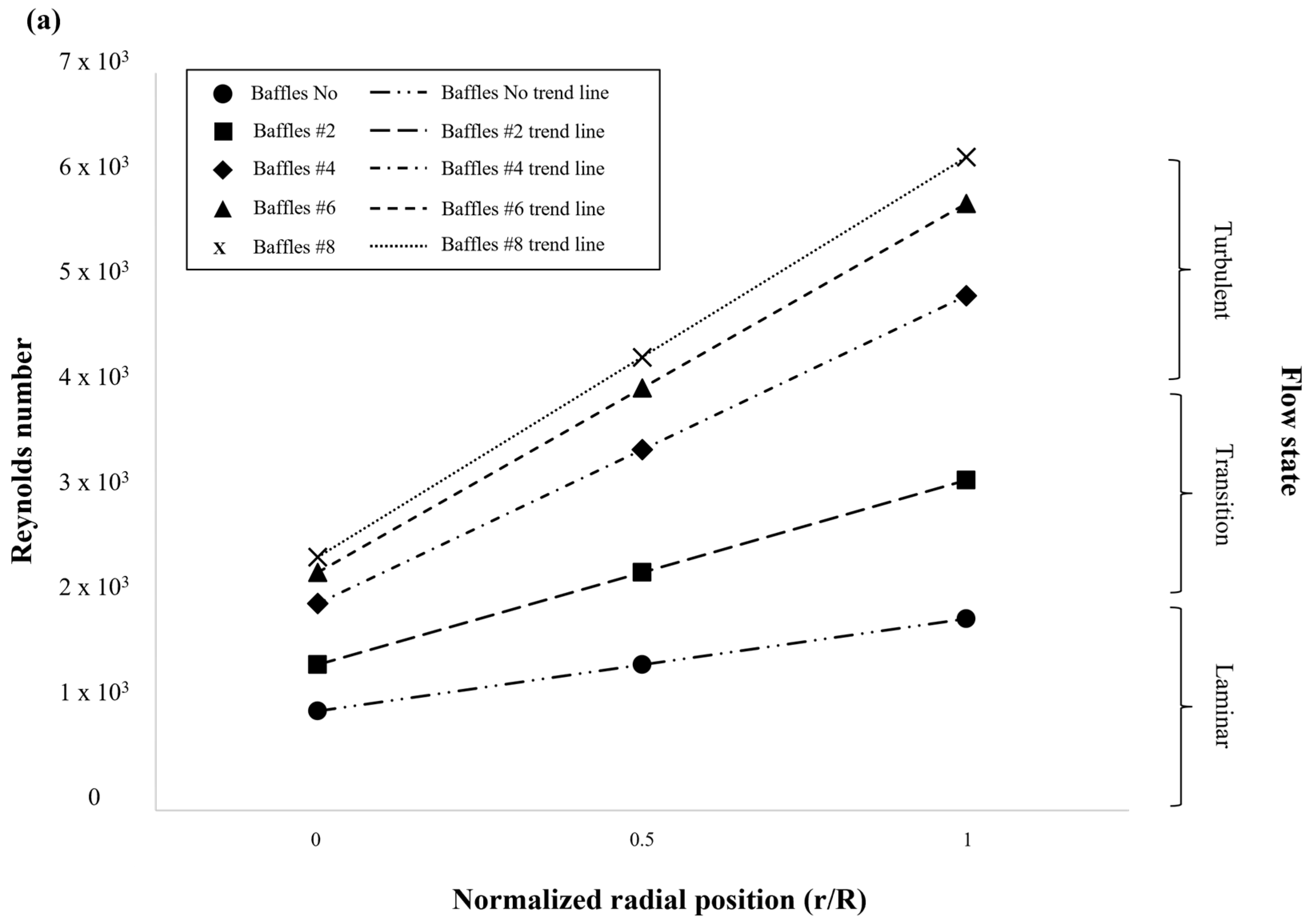 Figure 3, the Reynolds number decreased progressively with increasing viscosity across all baffle configurations (0, 2, 4, 6, and 8), reflecting the dominance of viscous forces over inertial effects. At low viscosities, inertial transport was sufficient to sustain turbulent eddies (Re > 4 × 10