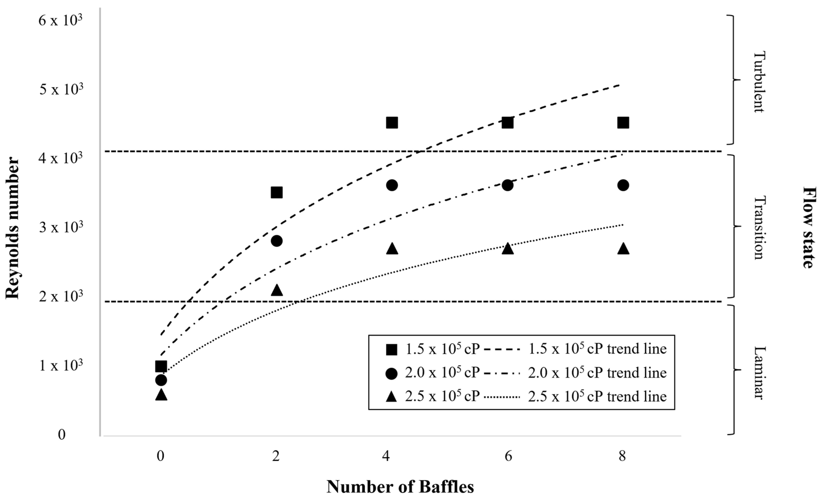 Figure 5, the Reynolds number increased with the number of baffles for all tested viscosities (1.5 × 10