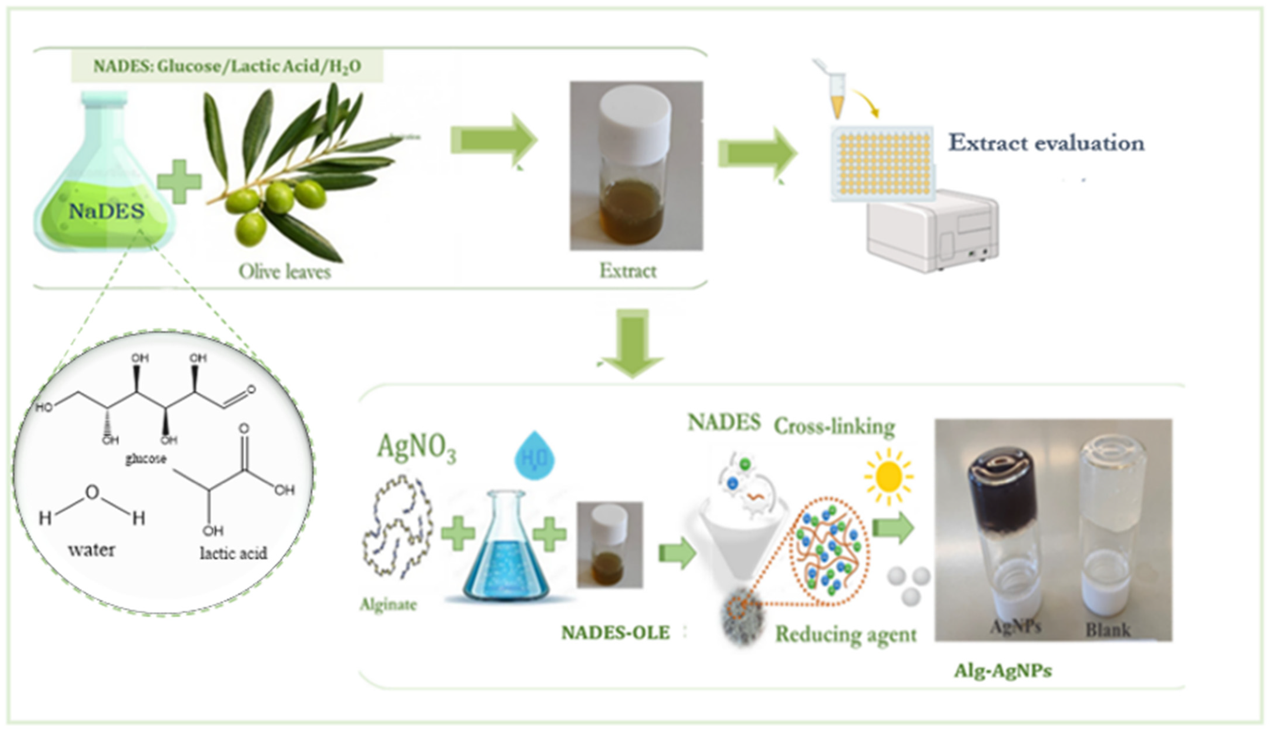 In the present work, AgNPs were synthesized using a green methodology and were incorporated into alginate hydrogels. A task-specific Natural Deep Eutectic Solvent (NADES) consisting of glucose and lactic acid was used as a solvent to extract bioactive phytochemicals from olive leaves. The as-obtained extract served a dual purpose: (a) as a crosslinking agent for the preparation of alginate hydrogels and (b) as a reducing agent for the synthesis of AgNPs. This environmentally friendly, non-thermal approach was further enhanced by utilizing sunlight as a sustainable energy source to facilitate the reduction process.