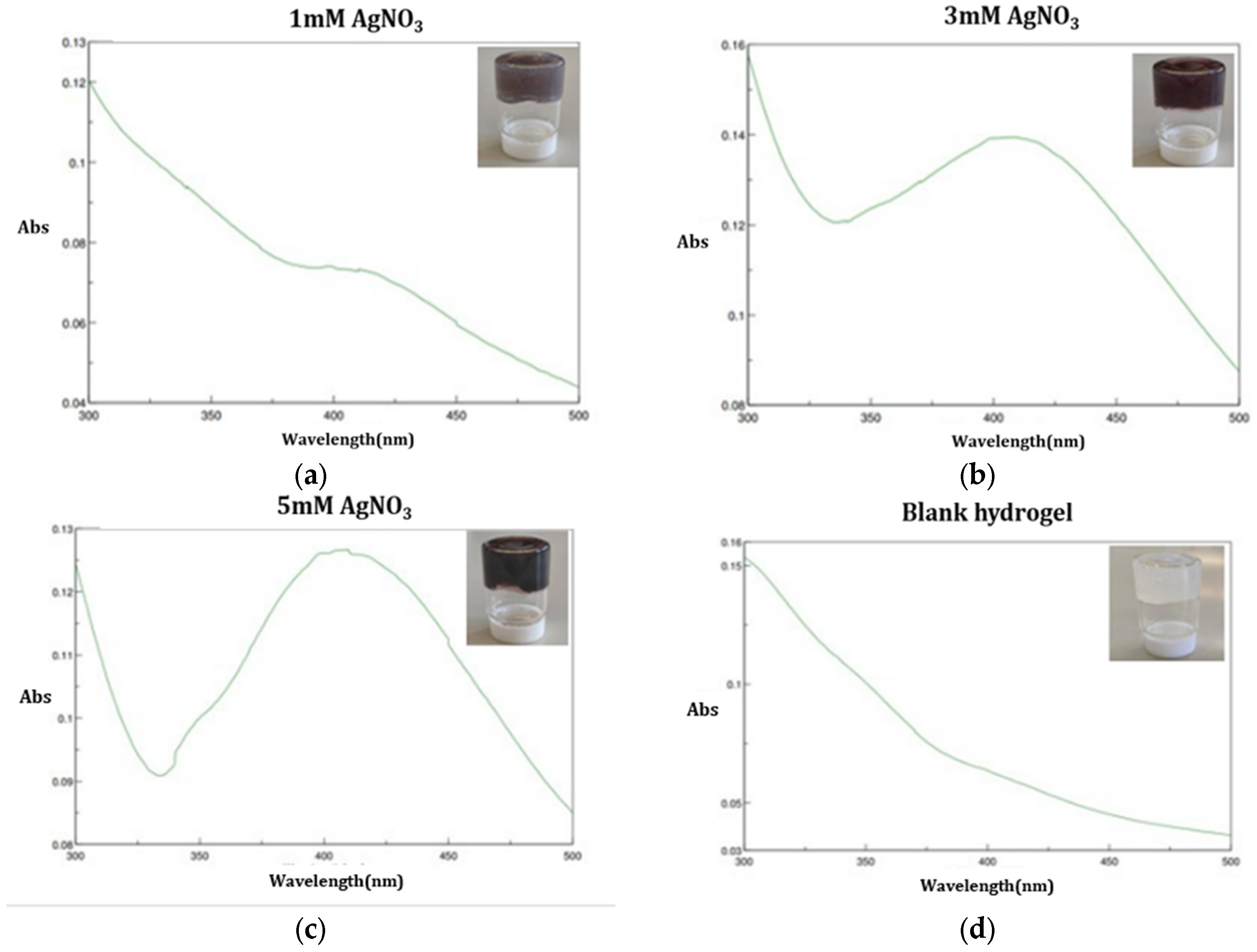 The formation of AgNPs was confirmed by UV–Vis spectroscopy. Figure 4 shows the UV-Vis absorption spectra of the AgNPs released from the nanocomposite hydrogel prepared by NADES-OLE. The spectra in Figure 4a–c exhibit an absorption peak at 420 nm, which is the typical surface plasmon resonance band for silver nanoparticles [13]. The blank hydrogel’s UV–Vis spectrum, as shown in Figure 4d, does not display any absorption band, as it does not contain silver nanoparticles. In contrast, the samples prepared with increasing concentrations of silver nitrate exhibit a progressively more defined and intense absorption peak, reflecting the formation of a greater number of AgNPs. Sivalingam and Pandian similarly reported that higher precursor concentrations lead to sharper and more intense SPR bands, confirming that increased availability of Ag+ ions promotes more extensive nanoparticle formation [29]. Furthermore, this characteristic single absorbance at 410–450 nm can be attributed to the formation of spherical nanoparticles.