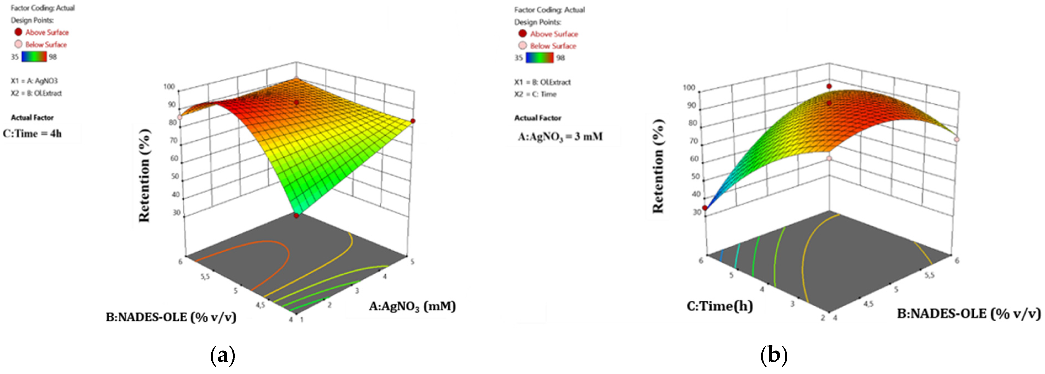 Figure 6. RSM plots for water retention response showing the correlation between water retention ratio and the factors (a) NADES-OLE and AgNO3 and (b) time and NADES-OLE.
