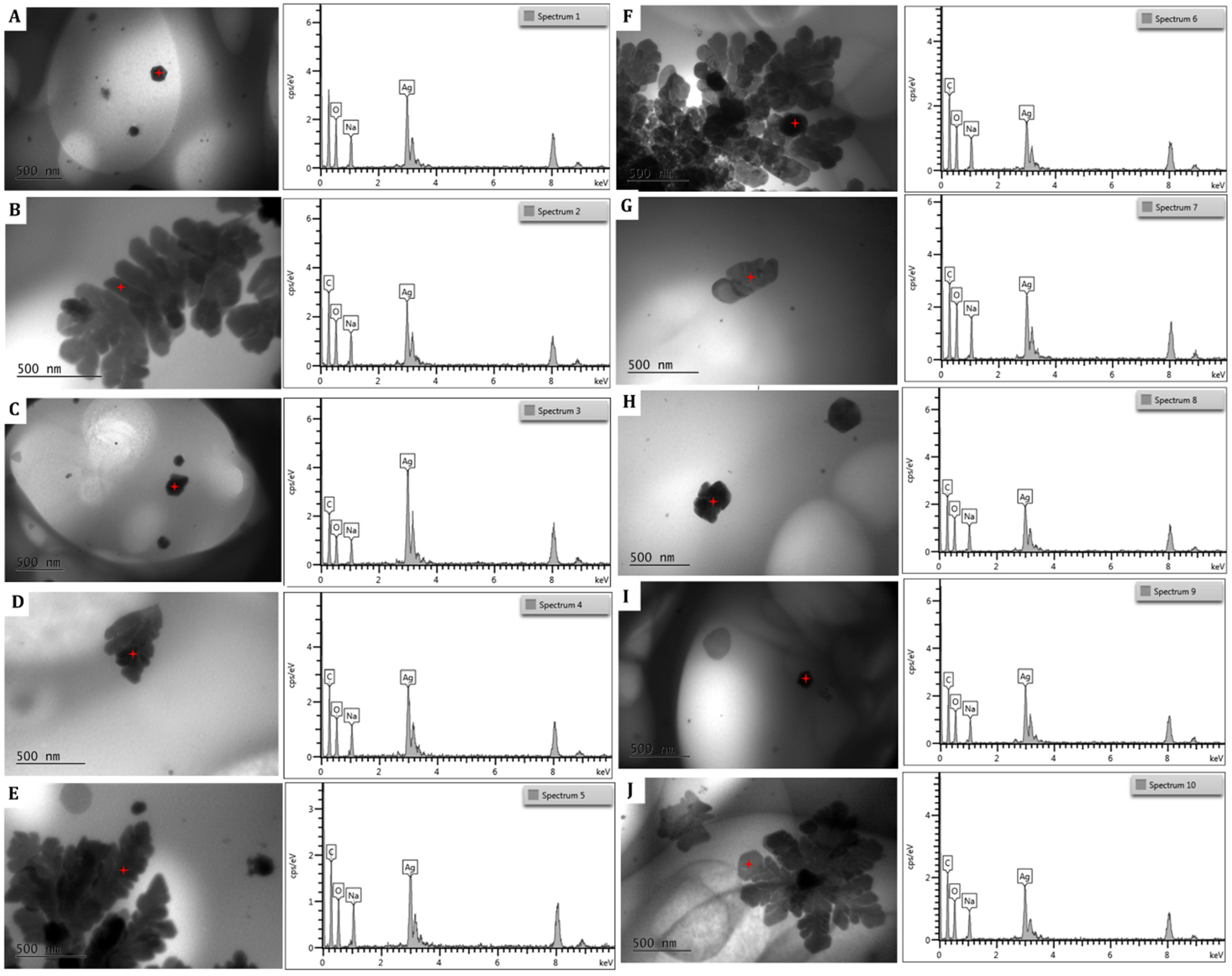 Figure 11. EDS spectra of the silver nanoparticles within the nanocomposite hydrogel. Letters (AJ) correspond to different EDS spectra obtained from distinct regions of the same sample, illustrating the elemental distribution and confirming the presence of silver. Red star highlights a representative nanoparticle (or cluster) for morphology characterization.