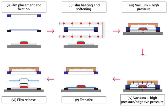 In addition, IMD offers limited flexibility in optimizing local heating, pressure distribution, or compensation strategies, which restricts its adaptability to next-generation products that require precise formability and high geometric freedom. By contrast, Out Mold Decoration (OMD) separates film preparation from substrate molding, allowing independent control of film preheating, vacuum forming, and high-pressure transfer [8,15,16,17,18,19,20], as illustrated in Figure 1. This separation enables the film to conform more accurately to complex geometries and helps overcome the deformation challenges frequently observed in IMD. Prior studies have shown that film thickness, thermal response, and interfacial characteristics significantly influence deformation behavior [21,22], while research on polymeric film formation has further demonstrated that intrinsic film properties, including dispersion stability, microstructure evolution, and membrane morphology, directly affect optical appearance, mechanical uniformity, and susceptibility to thinning during forming [22,23]. These findings collectively indicate that surface-decoration quality depends on the combined effects of thermal and mechanical processes as well as the inherent material behavior of the film [24,25]. Nevertheless, existing literature has mainly examined IMD molding parameters or film-forming characteristics separately and lacks an integrated framework that connects controlled processing variables with deformation mechanisms across three-dimensional geometries. This research gap is highly relevant to the increasing industrial demand for high-precision decorative components used in consumer products and automotive interiors, where visual quality and long-term durability strongly influence user perception and market competitiveness. Therefore, a systematic investigation is needed to clarify how process parameters and product geometry jointly determine adhesion, surface quality, and deformation behavior in OMD forming so that more reliable and advanced decorative manufacturing technologies can be developed.