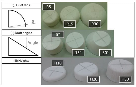 OMD-formed 3D specimens: (i) models with different fillet radii (ii) models with varying draft angles, and (iii) models with different heights.