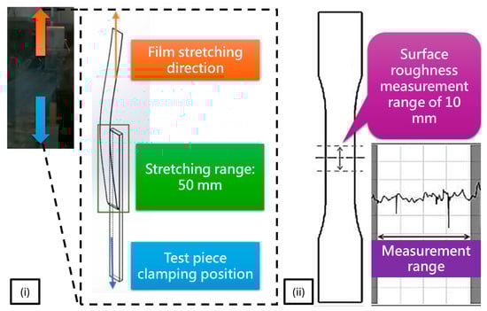 During peel testing, the film was mechanically separated from the substrate under a controlled displacement rate following the procedure outlined in the standard peel test (ASTM D903 [27]). This approach enabled direct measurement of the interfacial resistance and provided a realistic representation of the debonding behavior that may occur during OMD processing. The clamping configuration was designed to maintain a fully constrained and stable peeling path, ensuring uniform load transfer and minimizing slippage throughout the test (Figure 3i). The peel test was conducted by separating the film from the substrate at a constant 180° angle under a displacement-controlled loading rate of 20 mm/min, with a total upward displacement of 50 mm. The peel strip was trimmed to a width of 13 mm, corresponding to the designated specimen width used in this study. To assess changes in surface quality, roughness measurements were performed at predefined locations on the film surface, with a measurement length of 10 mm, as shown in Figure 3ii. An instrument for measuring surface roughness (SJ-310, Mitutoyo, Taichung, Taiwan) was used to obtain Ra values with high precision. These measurements enabled detailed characterization of surface deviations induced by stretching, thermal softening, and localized strain of the film, thereby providing insights into how processing conditions influence surface integrity and post-forming appearance.