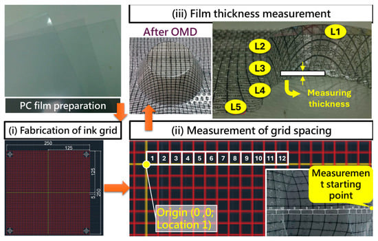 Preparation and Measurement Procedure for 3D Forming Films: (i) Fabrication of ink grid. (ii) Measurement of grid spacing. (iii) Film thickness measurement.