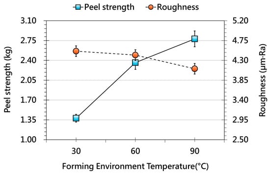 Effect of different forming environment temperature on the peel strength (solid line, primary y-axis) and surface roughness (dashed line, secondary y-axis) of OMD films after forming.