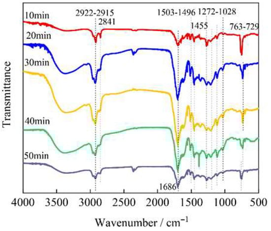 FT-IR analysis (Figure 2) showed the chemical composition of bio-oil changes with reaction time at 360 °C. The absorption peaks at 2922–2841 cm−1, related to –CH2– groups, decrease over time, indicating reduced aliphatic content. Meanwhile, the peak at 1686 cm−1 strengthens, suggesting the formation of carbonyl compounds like ketones or aldehydes. Increased intensity in the aromatic regions (1503–1496 cm−1 and 763–729 cm−1) reflects growing aromatization and ring substitution. These trends matched the TGA results: as shown in Table 2, lighter fractions (naphtha and kerosene) stabilize or decline after 30 min, while heavier fractions (diesel and residue) increase, indicating more cracking and repolymerization. These findings aligned with previous studies [26,27] showing that longer hydrothermal treatment enhanced aromatization and heavy compound formation, affecting bio-oil quality.