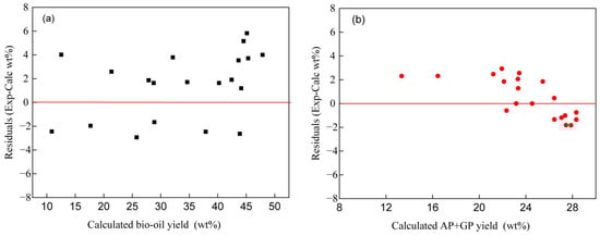 Residual plot of the kinetic model for bio-oil (a) and AP + GP yield (b).