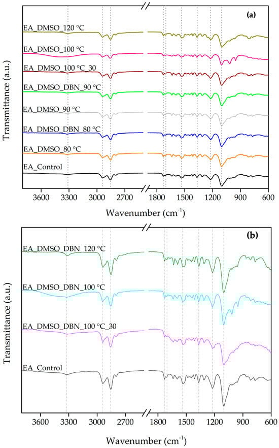 ATR-FTIR spectra of elastane (EA) before and after solvent treatments in DMSO and DMSO + DBN (3800–600 cm−1). (a) Spectra of untreated EA (control) and EA treated at the indicated temperatures and times; (b) Spectra of control and the solid residues recovered by centrifugation from the corresponding treatment baths. Dashed lines indicate the specific wavenumbers of the elastane filaments.