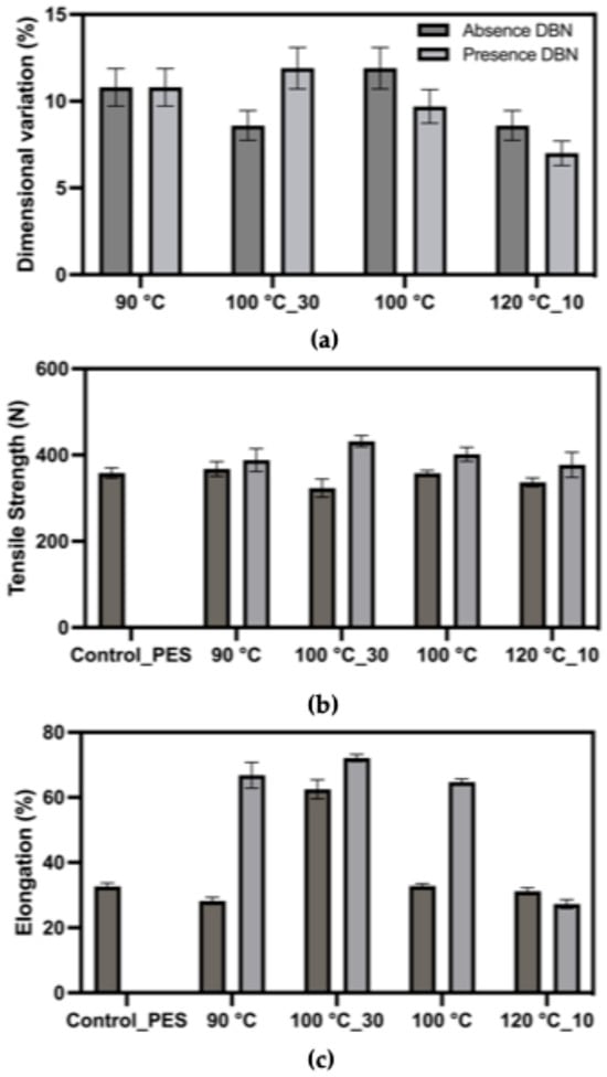 In the polyester/elastane fabric (Figure 6), dimensional variation values were slightly lower overall, ranging from 7% to 13%, relative to an initial area of 361 cm2. Treatments at 100 °C, both with and without DBN, resulted in the highest variation, again indicating notable alteration to the fabric’s elastic response. The addition of DBN did not systematically increase variation, suggesting different solvent-fibre interactions compared to the cotton blend. Tensile strength remained relatively consistent across treatments, with most values clustering around 320–380 N. This suggests that polyester fibres maintained their mechanical resistance throughout the degradation process, in line with their known chemical stability. Elongation values varied more widely than in the cotton-based fabric, reaching up to 60% in samples treated at 90 °C and 100 °C with DBN, indicating that, after treatment, deformation proceeds through plastic extension rather than classic elastane-driven elastic recovery. In contrast, samples treated at 120 °C or without DBN generally showed lower elongation, suggesting more effective elastane disruption or morphological compaction.