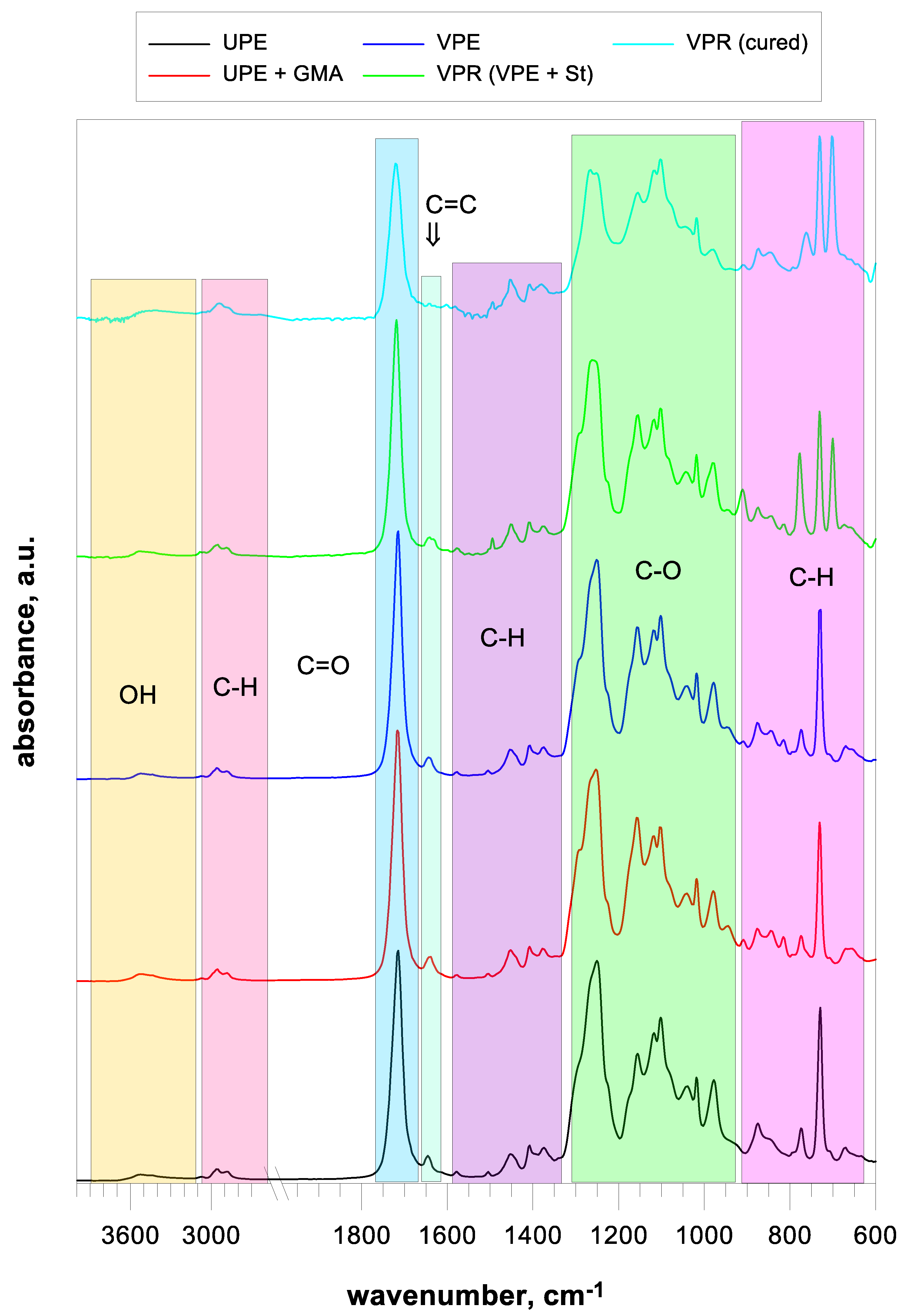 Figure 3, VPE). Moreover, the wavenumber value corresponding to OH and the band shape were shifted due to the transformation of the polyester end groups. The band from the unsaturated fumarate bond still appears in the spectrum in an unchanged form. This confirms that an additional reaction, not polymerization, has occurred.