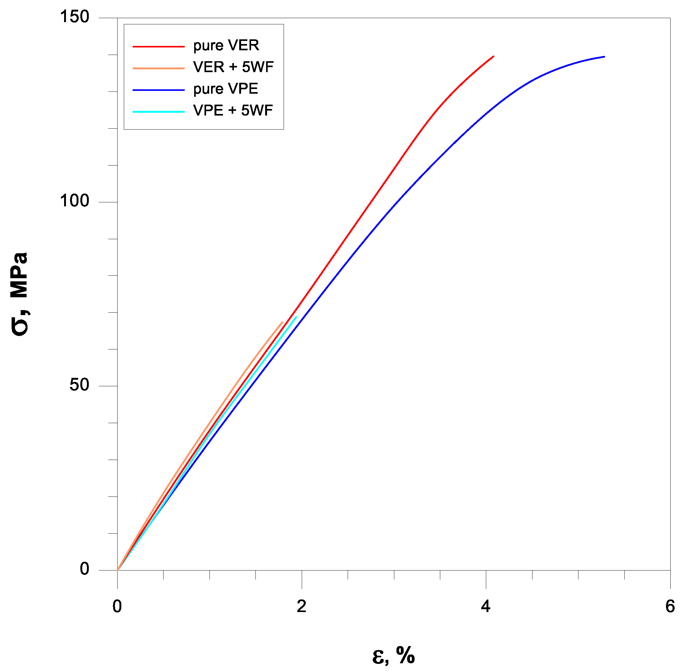 The pure VER and VPE resins showed the flexural modulus () of 3.84 and 3.49 GPa, respectively. The addition of WF increased the modulus of the composite compared to unmodified VER and VPE, which indicates a positive effect on the composite stiffness.