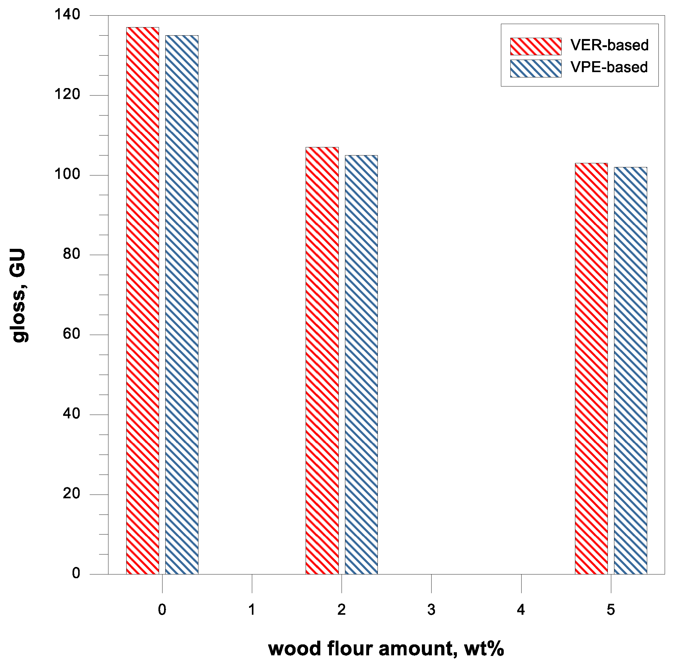 From the data obtained, it can be concluded that with the addition of wood filler, the gloss decreases. This phenomenon is very well known and observed for polymers [