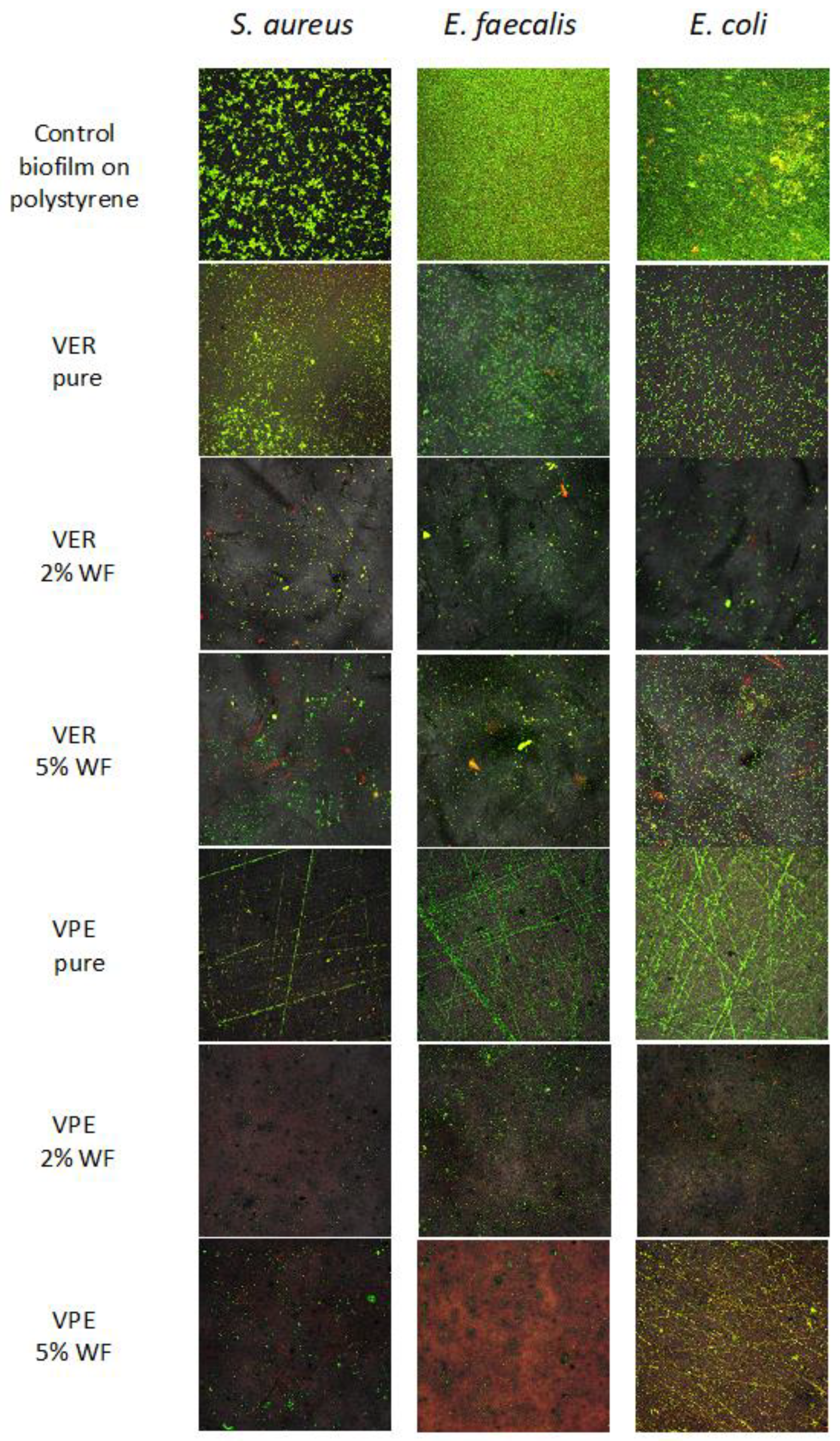 Figure 7 show that on pure VER and VPE resins, all Gram-positive and Gram-negative strains exhibited much weaker adhesion and did not form a monolayer, in contrast to the biofilm growth on polystyrene control. On the pure materials, biofilm appeared only locally and was limited to the areas where the sample was scratched or created wrinkles, as visible in the confocal microscope images. The VPE samples exhibited more such wrinkles than the VER one.