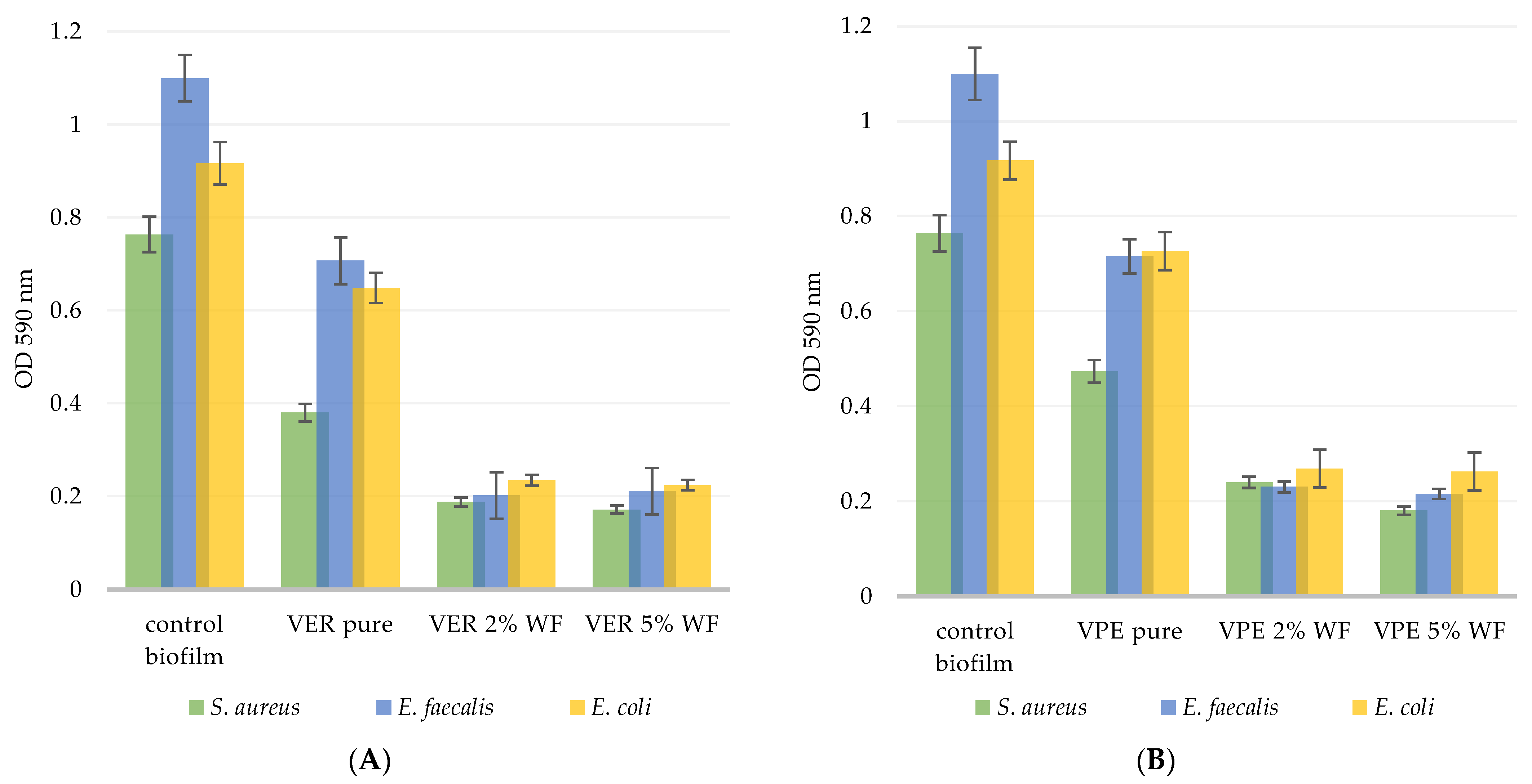 For VPE, the percentage of biofilm inhibition for 2% and 5% WF modifications was as follows: