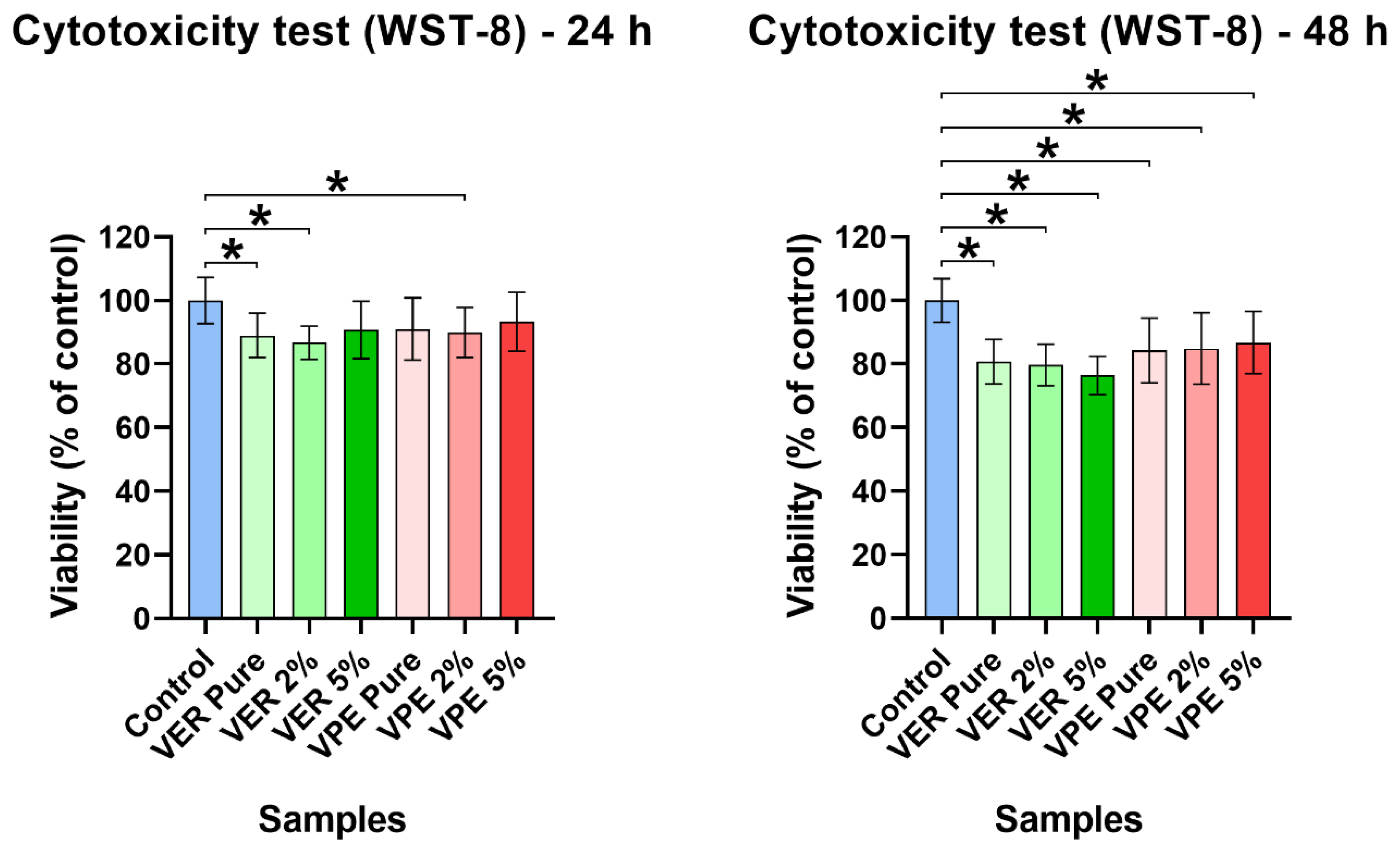 Cytotoxicity tests revealed that the tested materials based on different vinyl ester resins were non-toxic to skin fibroblasts. The WST-8 test showed that both the native and modified variants (pure or WF-enriched) had no adverse effects on normal human fibroblasts after both 24 h and 48 h exposure to 24 h extracts. However, the cell viability after exposure to 48 h extracts of VER 5%WF was reduced to approximately 76% compared to the polystyrene control, likely due to the higher amount of wood flour in 48 h extracts. It is worth noting that according to the ISO 10993-5, all tested materials are considered non-toxic, as cell viability did not fall below 70% [