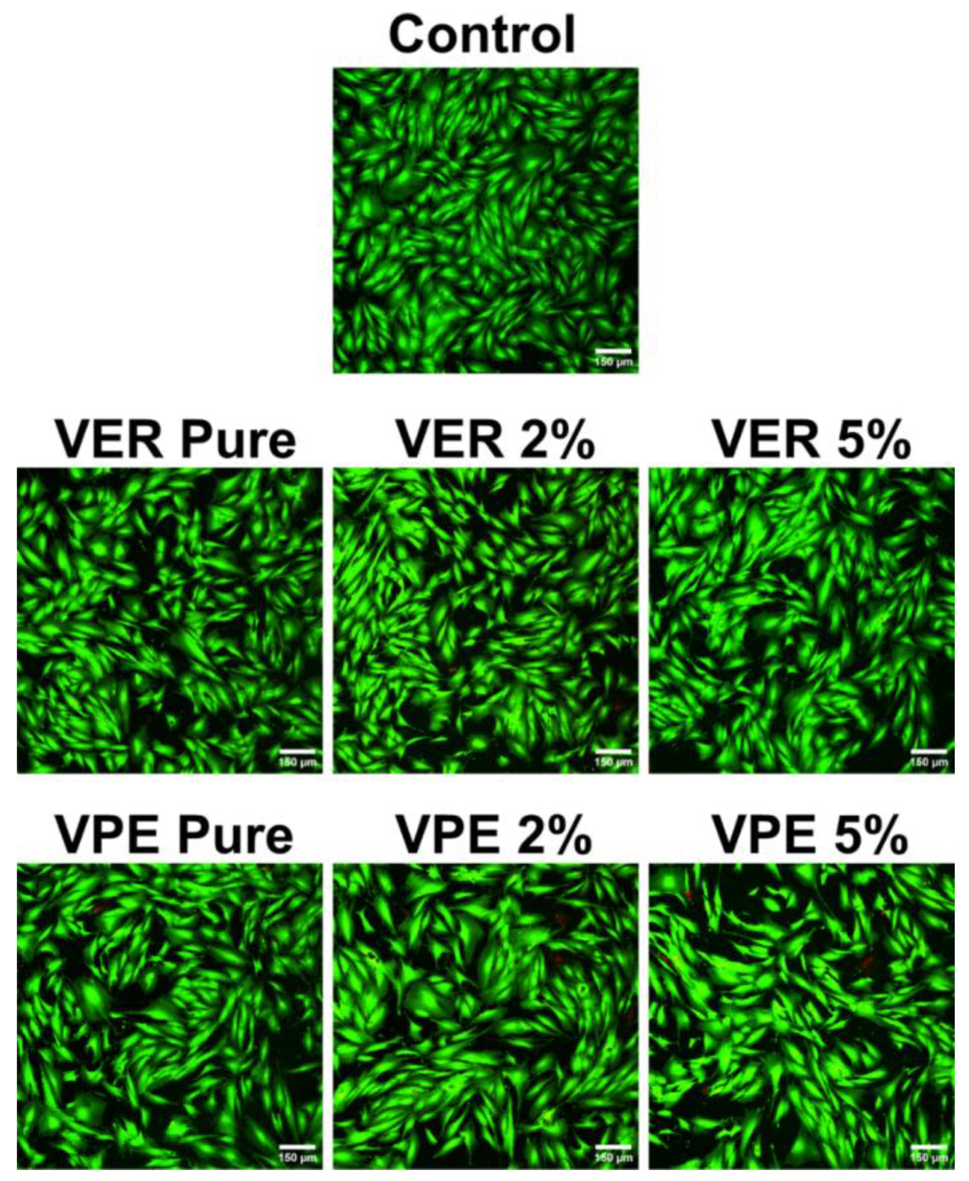 Cytotoxicity of the resin materials was also assessed using the indirect contact method with Live/Dead fluorescent staining of BJ fibroblasts grown in the presence of 24 h extracts of the tested materials. CLSM images revealed a healthy monolayer of viable cells with typical spindle-shaped morphology after exposure to all tested extracts, as shown in