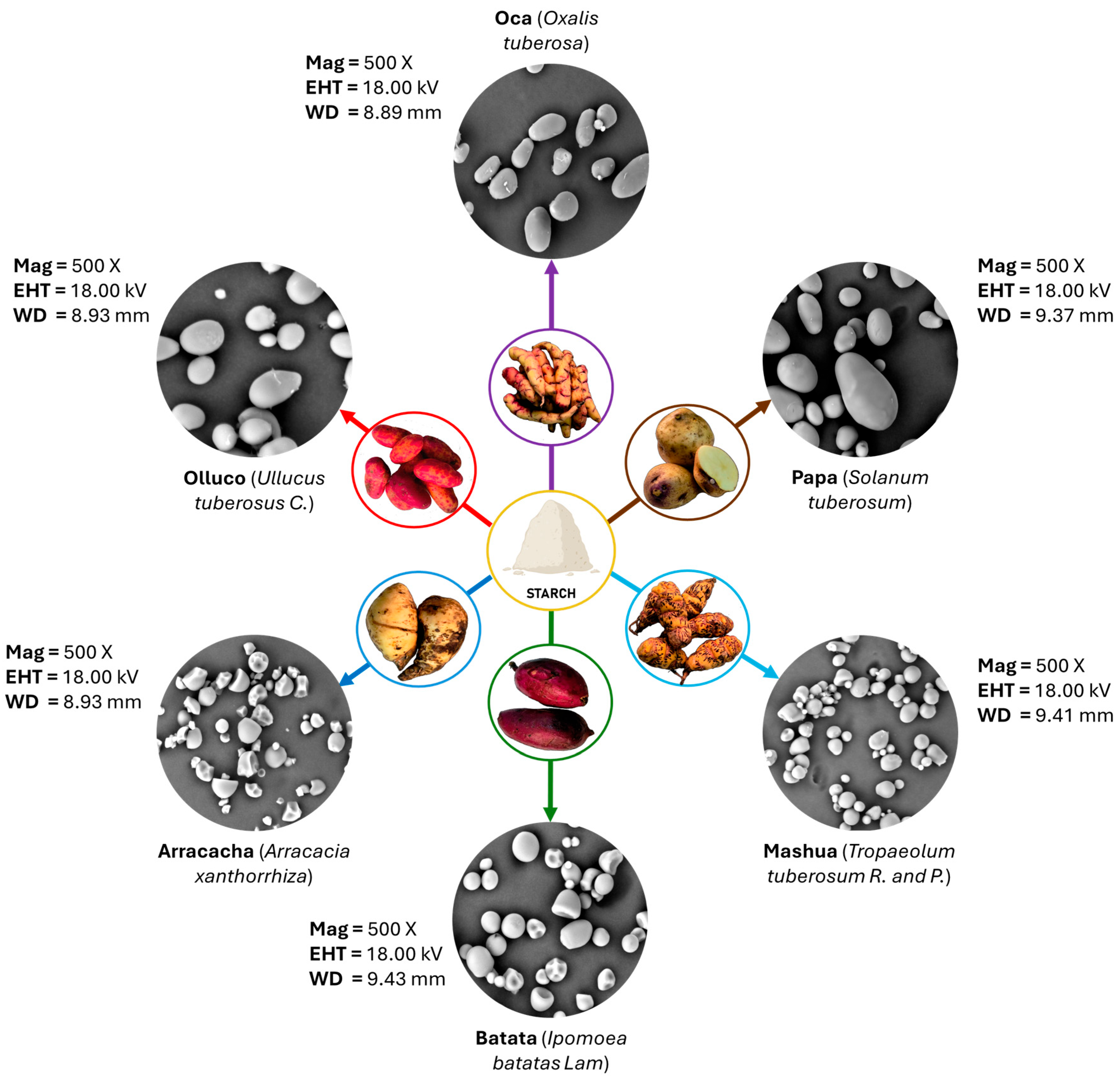 - Fonseca-Santanilla, E.B.; Betancourt-López, L.L. Physicochemical and structural characterization of starches from Andean roots and tubers grown in Colombia. Food Sci. Technol. Int. 2022, 28, 144–156. [Google Scholar] [CrossRef]