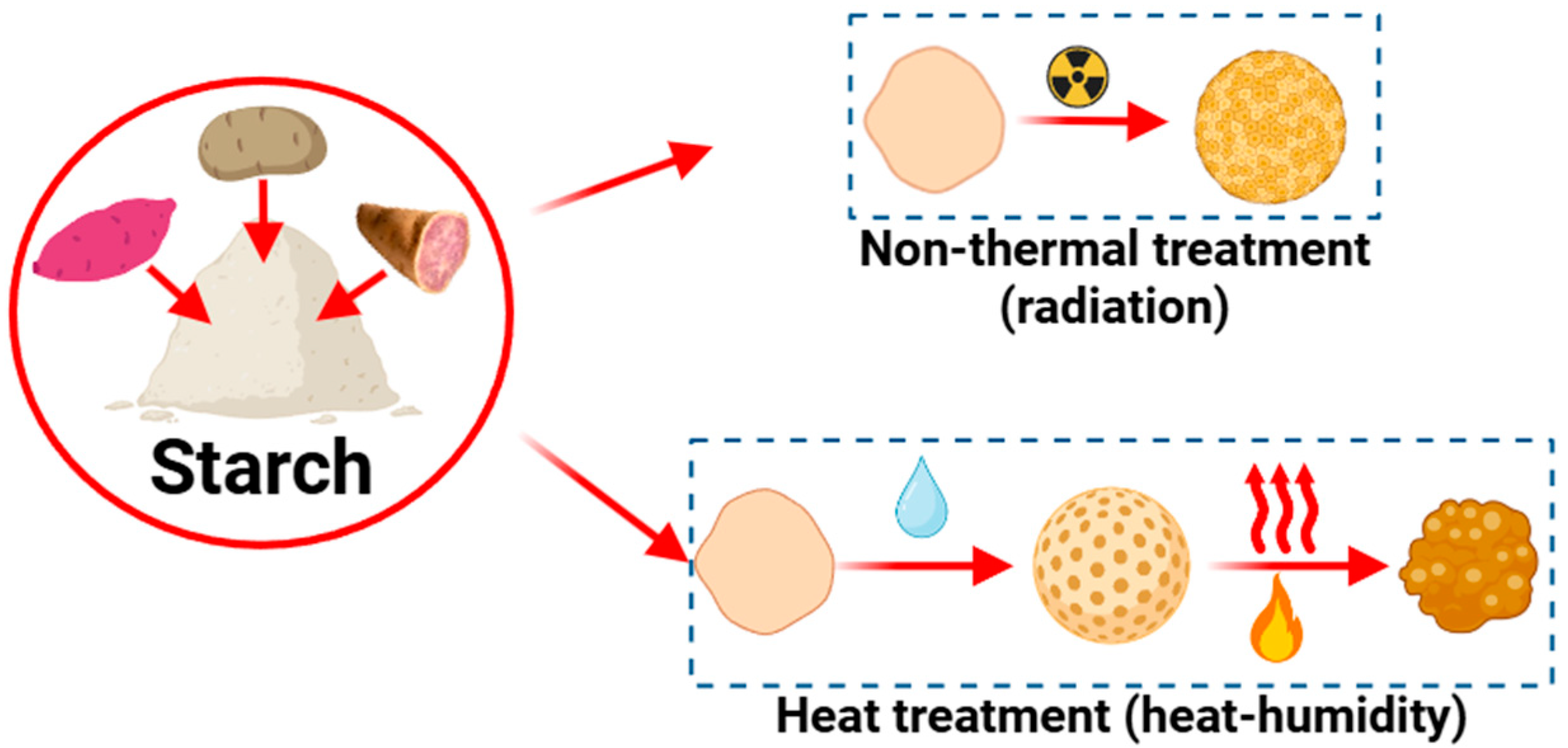- Olawoye, B.; Popoola-Akinola, O.; Fagbohun, O.F.; Adetola, D.B.; Adeloye, A.E.; Abdulwahab, A.A.; Ogunjemilusi, M.A.; Olaoye, I.O. Starch Modification Using Sustainable Processing Technology: Impacts and Applications. Starch-Stärke 2024, 77, 2400115. [Google Scholar] [CrossRef]