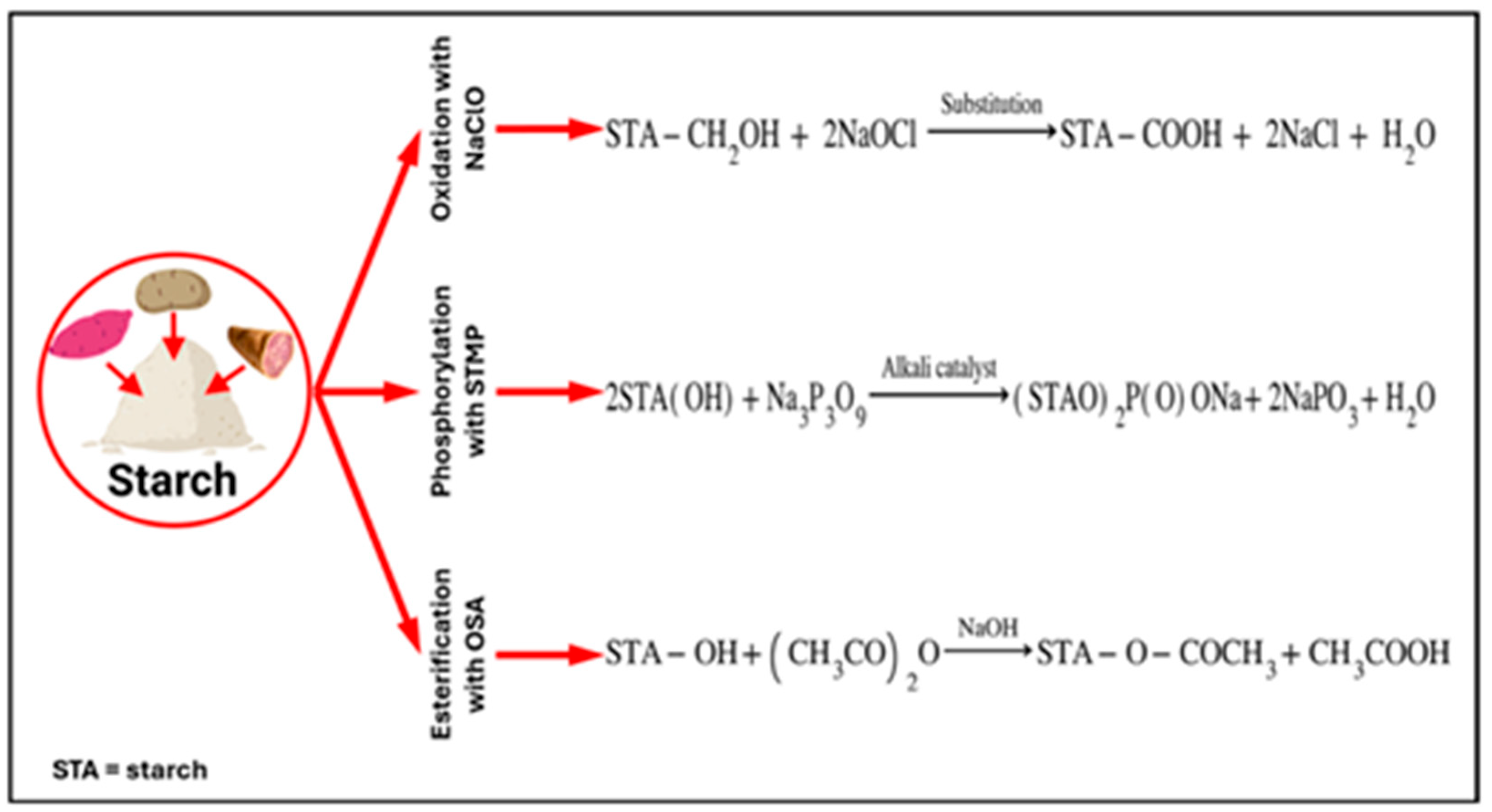 - Ali, T.M.; Haider, S.; Shaikh, M.; Butt, N.A.; Zehra, N. Chemical Crosslinking, Acid Hydrolysis, Oxidation, Esterification, and Etherification of Starch. In Advanced Research in Starch; Springer Nature: Singapore, 2024; pp. 47–94. [Google Scholar] [CrossRef]