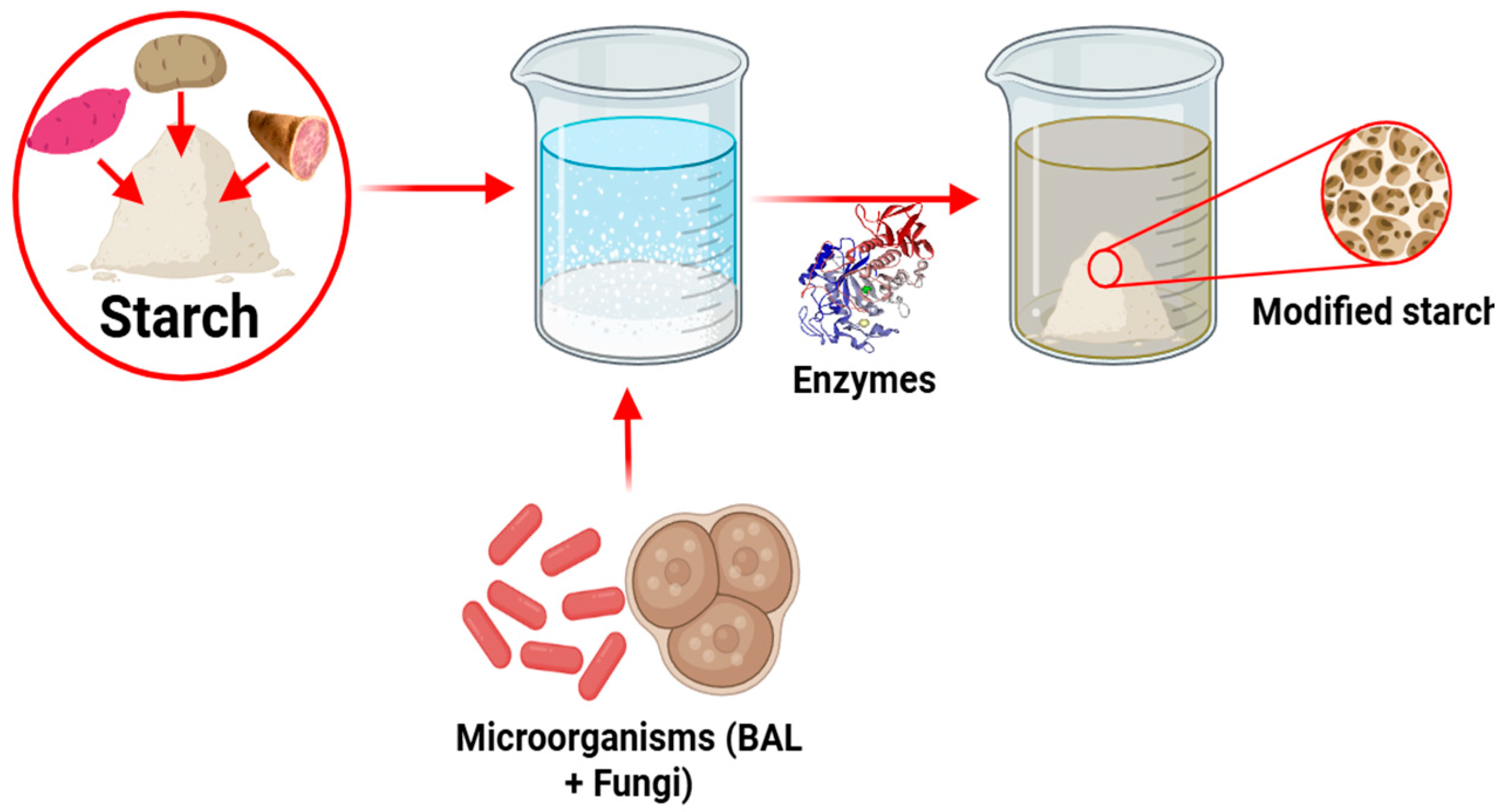 - Latip, D.N.H.; Samsudin, H.; Utra, U.; Alias, A.K. Modification methods toward the production of porous starch: A review. Crit. Rev. Food Sci. Nutr. 2021, 61, 2841–2862. [Google Scholar] [CrossRef] [PubMed]