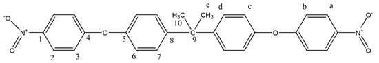 The reaction was the same as that of the BPS-based compound. Briefly, 0.075 mol BPA, 0.16 mol 1-chloro-4-nitrobenzene, 0.16 mol potassium carbonate, and 300 mL DMF were placed in a 3-neck flask with a nitrogen inlet and a reflux condenser. It was refluxed at 160 °C under a N2 atmosphere for 16 h. After the reaction was completed, the mixture was dropped into an ice–water mixture. The precipitate, collected by filtration, was dried in a vacuum oven and then crystallized in ethanol. The yellow dinitro compound was obtained in 60% yield (Figure 3). mp: 123–124 °C.