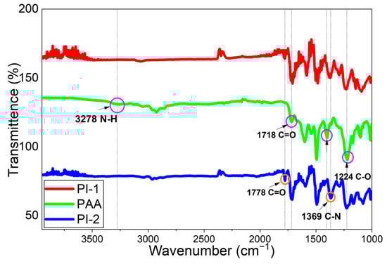 The FTIR spectra of the PAA and PI samples are shown in Figure 6. According to Figure 6, the peak observed around 3278 cm−1 belongs to the ammonium groups, the peak observed at 1718 cm−1 belongs to the aromatic carboxyl group (C=O), the amide carbonyl group at 1660 cm−1, the N–H, C–N stretches at 1404 cm−1 and C-O stretches at 1224 cm−1. After gradual heating, the polyamic acid transforms into polyimide. This transformation is confirmed by the peaks in the PI spectrum belonging to the aromatic imide carbonyl group at approximately 1778 cm−1. On the other hand, the increasing of the C–N bonds grow with the peak wavenumber at 1369 cm−1, confirming the complete transformation of PAA to polyimide [15,44,45,46].