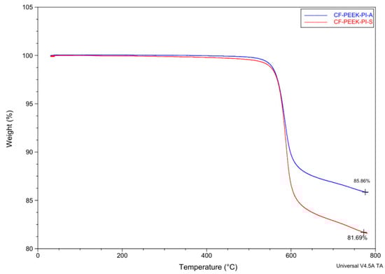 TGA Analysis of CF-PEEK-PI-A and CF-PEEK-PI-S Composites.