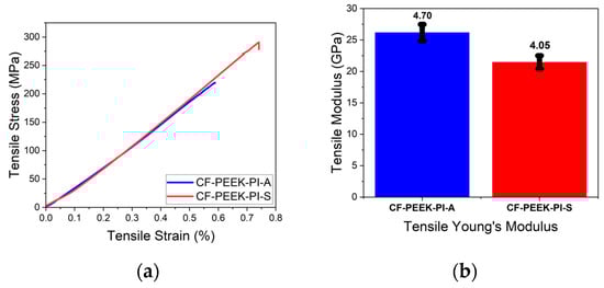 From the obtained tensile test result (Figure 11), the CF-PEEK-PI-S sample showed higher tensile strength (288 ± 10 MPa) than the CF-PEEK-PI-A sample (223 ± 39.1 MPa). In the literature, Gao et al. [14], reported a tensile strength of approximately 795 MPa for CF/PEEK composites process by hot-pressing without sizing agent. This tensile value can be attributed to the differences in the manufacturing process. On the other hand, CF-PEEK-PI-A sample showed superior properties with its elastic modulus value of 26.2 ± 4.70 GPa, which was higher than the CF-PEEK-PI-S sample, which had a value of 21.4 ± 4.05 GPa.