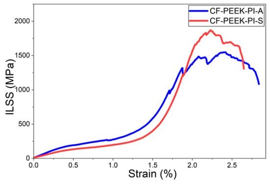 Therefore, mechanical properties should not be compared directly with high-performance prepregs but rather evaluated in the context of powder-based CF/PEEK composites. In this category, the PI-S modification shows significant improvement in ILSS, indicating increased interfacial interaction.