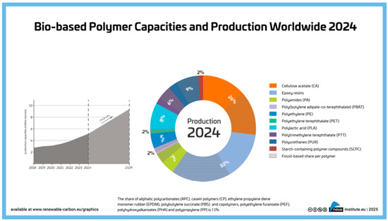 - International Biopolymer Expert Group of the Nova-Institute. Bio based Building Blocks and Polymers—Global Capacities, Production and Trends 2024–2029. Available online: https://renewable-carbon.eu/news/global-bio-based-polymer-market-to-grow-13-annually-through-2029-led-by-asia-and-north-america/ (accessed on 1 December 2025).