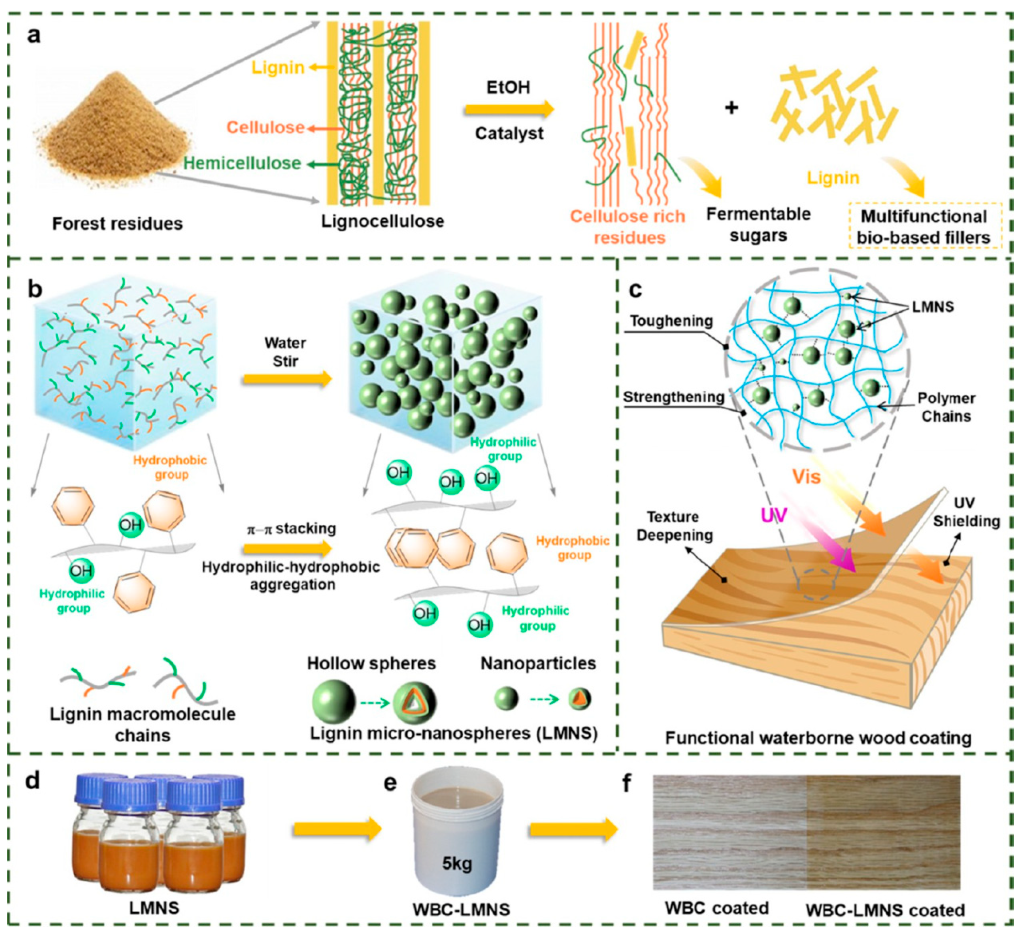 - Ma, B.; Xiong, F.; Wang, H.; Qing, Y.; Chu, F.; Wu, Y. Tailorable and scalable production of eco-friendly lignin micro-nanospheres and their application in functional superhydrophobic coating. Chem. Eng. J. 2023, 457, 141309. [Google Scholar] [CrossRef]
