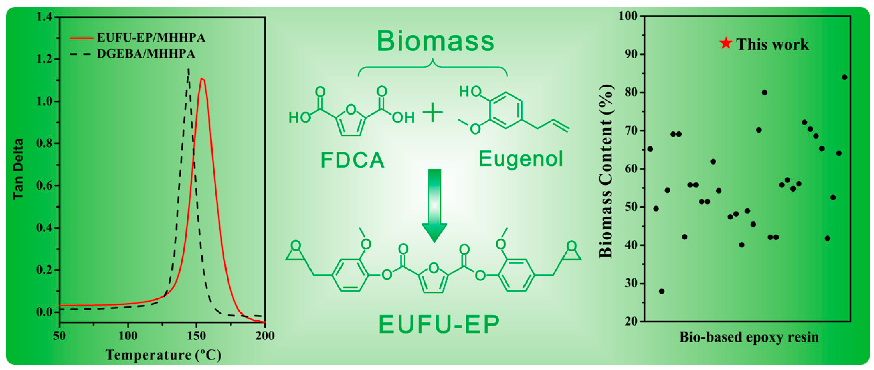 - Miao, J.-T.; Yuan, L.; Guan, Q.; Liang, G.; Gu, A. Biobased Heat Resistant Epoxy Resin with Extremely High Biomass Content from 2,5-Furandicarboxylic Acid and Eugenol. ACS Sustain. Chem. Eng. 2017, 5, 7003–7011. [Google Scholar] [CrossRef]