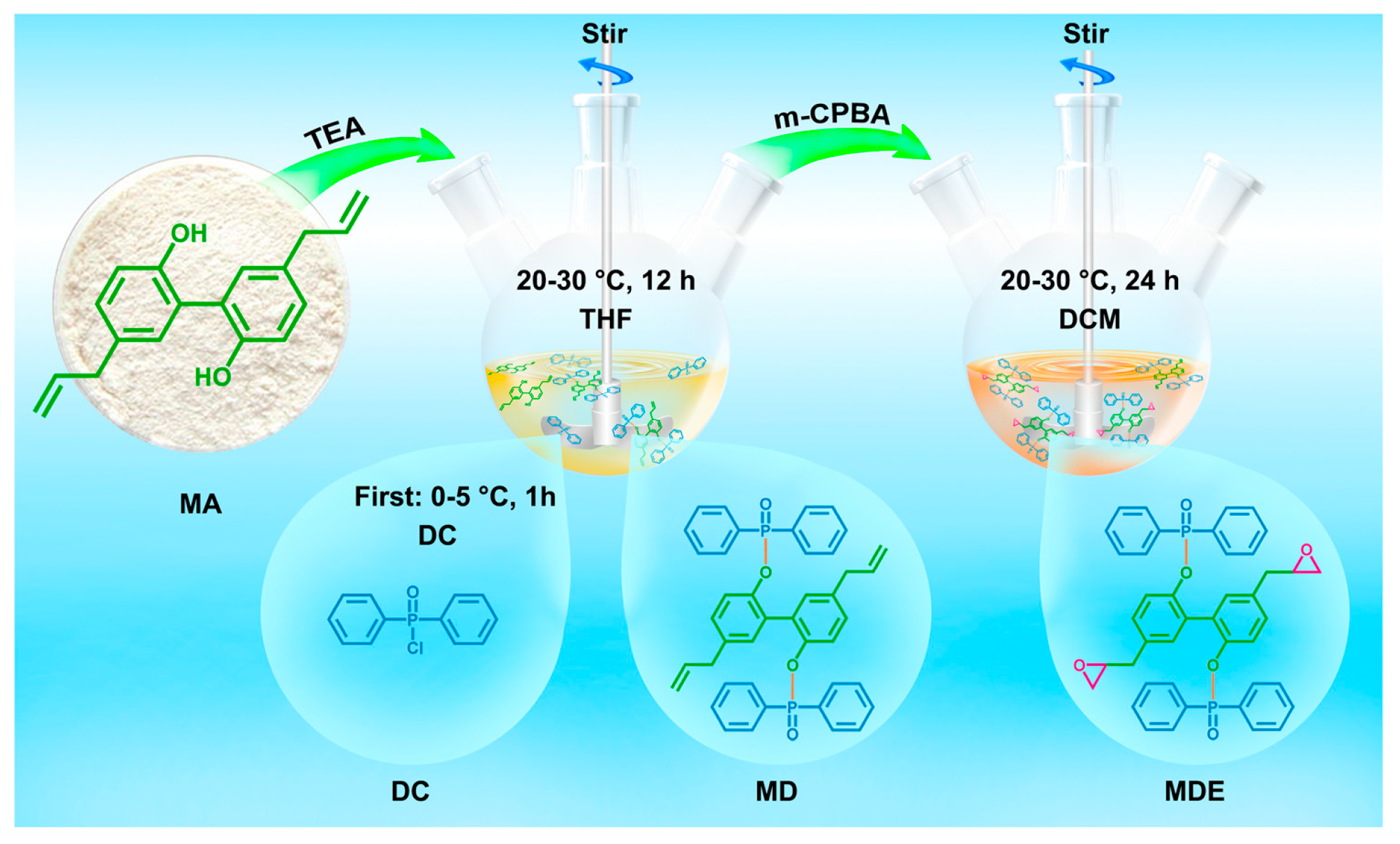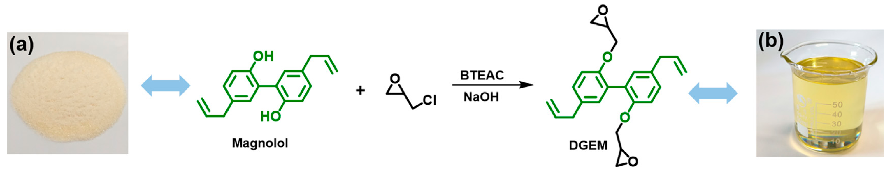 - Cao, Q.; Weng, Z.; Qi, Y.; Li, J.; Liu, W.; Liu, C.; Zhang, S.; Wei, Z.; Chen, Y.; Jian, X. Achieving higher performances without an external curing agent in natural magnolol-based epoxy resin. Chin. Chem. Lett. 2022, 33, 2195–2199. [Google Scholar] [CrossRef]