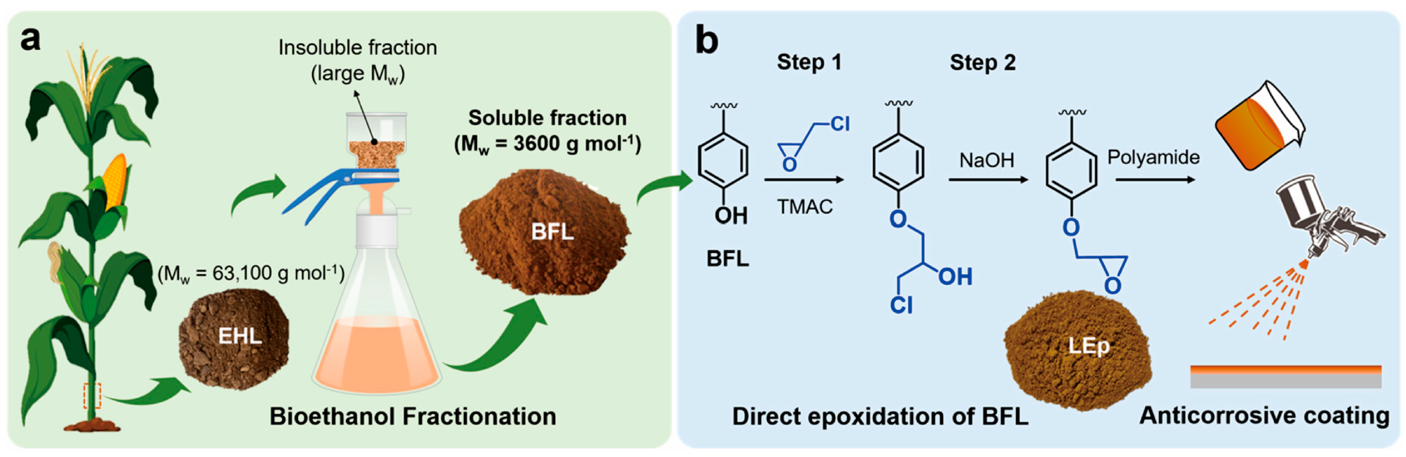 - Wang, X.; Leng, W.; Nayanathara, R.M.O.; Caldona, E.B.; Liu, L.; Chen, L.; Advincula, R.C.; Zhang, Z.; Zhang, X. Anticorrosive epoxy coatings from direct epoxidation of bioethanol fractionated lignin. Int. J. Biol. Macromol. 2022, 221, 268–277. [Google Scholar] [CrossRef]