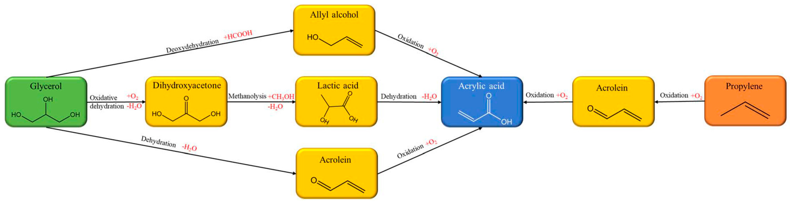 - Sun, D.; Yamada, Y.; Sato, S.; Ueda, W. Glycerol as a potential renewable raw material for acrylic acid production. Green Chem. 2017, 19, 3186–3213. [Google Scholar] [CrossRef]