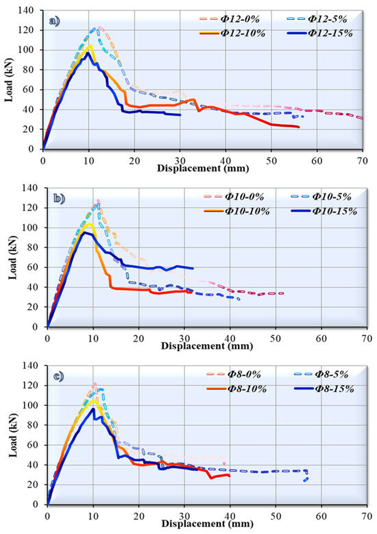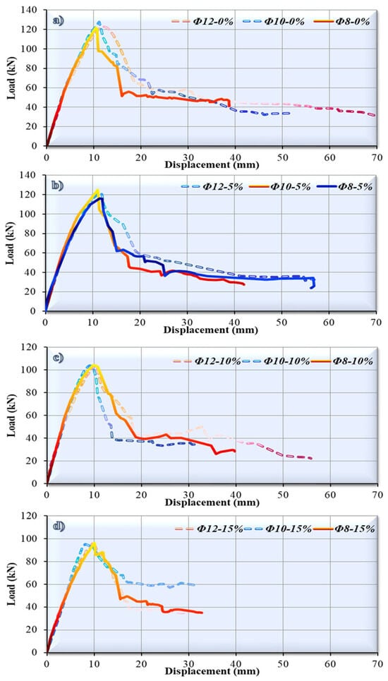 As a consequence of the experiment, vertical load–displacement graphs were produced, and the damage occurring to the generated beam specimens was analyzed in order to investigate bending performance. Figure 5 presents a graphical representation of the results. By examining the load–displacement diagrams generated following the investigation, it was possible to determine that, in the experiments where the tensile reinforcement was chosen as Ø12, the maximum load level was attained at 123 kN at 12 mm displacement when there was no waste tire (reference beam-Ø12-0%). The greatest load carried and the amount of displacement related to this load were discovered to decline as the tire proportion rose, as observed in Figure 5a.