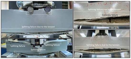 The general damage observed in the Pultruded GFRP composite beams as a result of the experimental study is shown in Figure 9. As can be seen, the material with the pultruded GFRP profile delayed but did not prevent the occurrence of flexural and shear damage observed in the reinforced concrete beam. Generally, the first instance of damage was observed in the flexural region of the beam, and splitting damage occurred in the pultruded material. As the vertical load increased, splitting damage continued to expand, and web-flange separation due to splitting was observed in the compression zone of the beam. Meanwhile, both shear damage and bending damage have already occurred in the reinforced concrete beam, and local indentation failure was also observed at the beam’s loading point.