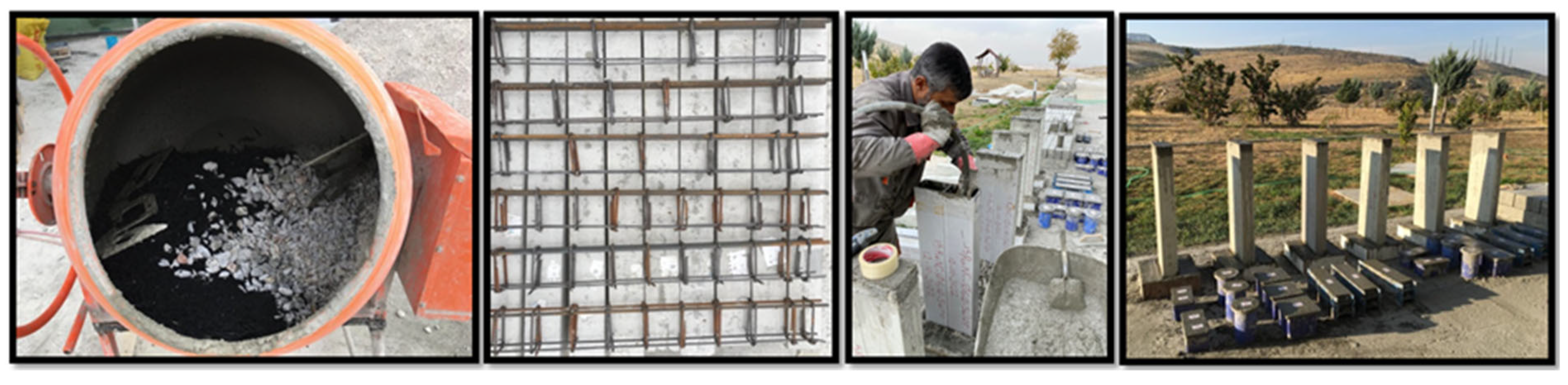 - Eldin, N.N.; Senouci, A.B. Rubber-tire particles as concrete aggregate. J. Mater. Civ. Eng. 1993, 5, 478–496. [Google Scholar] [CrossRef]