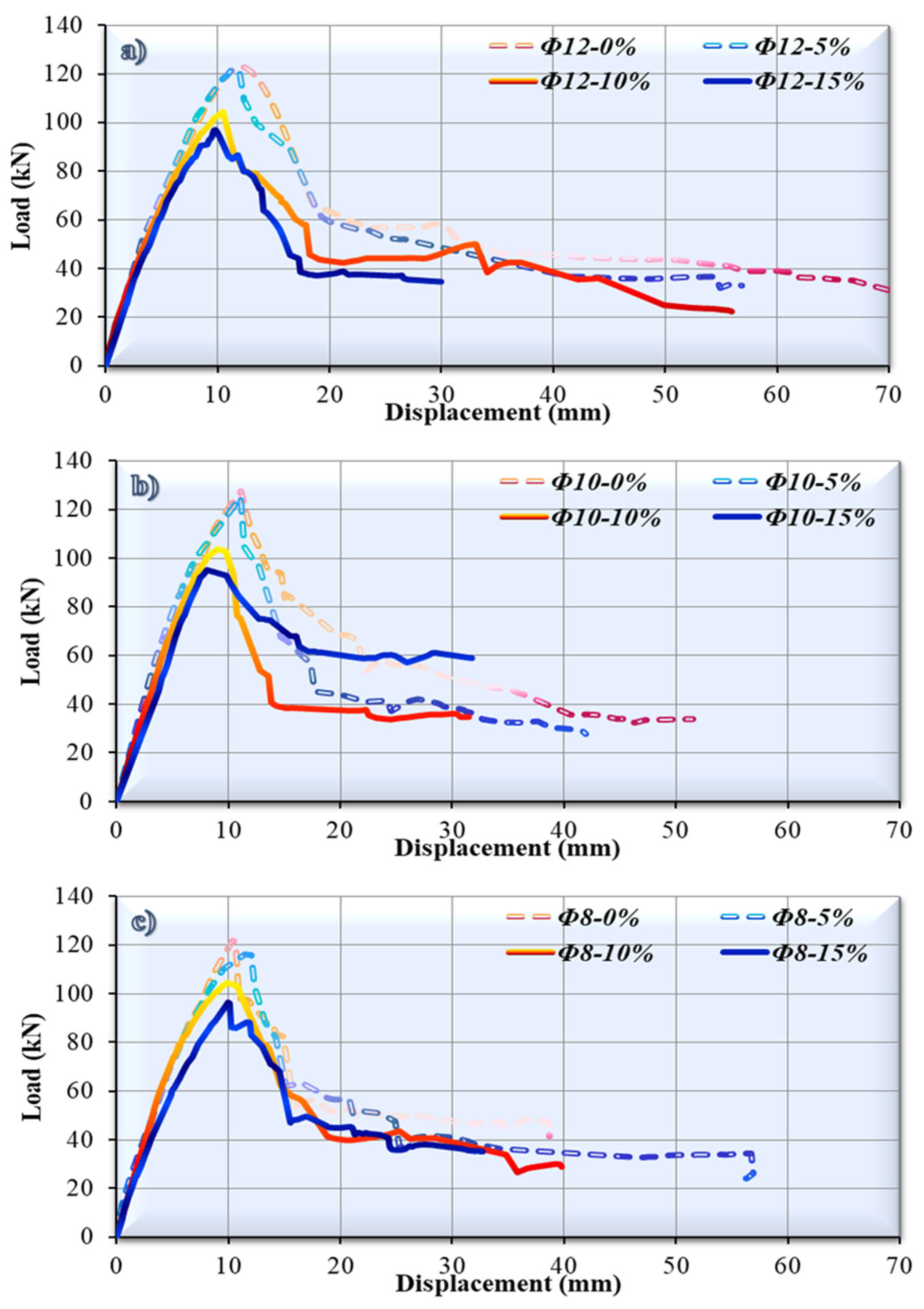 - When the ratio of the waste rubber aggregate is 15%, although the maximum load-carrying capacity decreases with increasing longitudinal reinforcement ratios (Ø12-15% > Ø10-15% > Ø8-15%), the approximate load-carrying capacities of the specimens are similar (Ø12-15% = 96.72 kN > Ø10-15% = 95.28 kN > Ø8-15% = 96.39 kN).